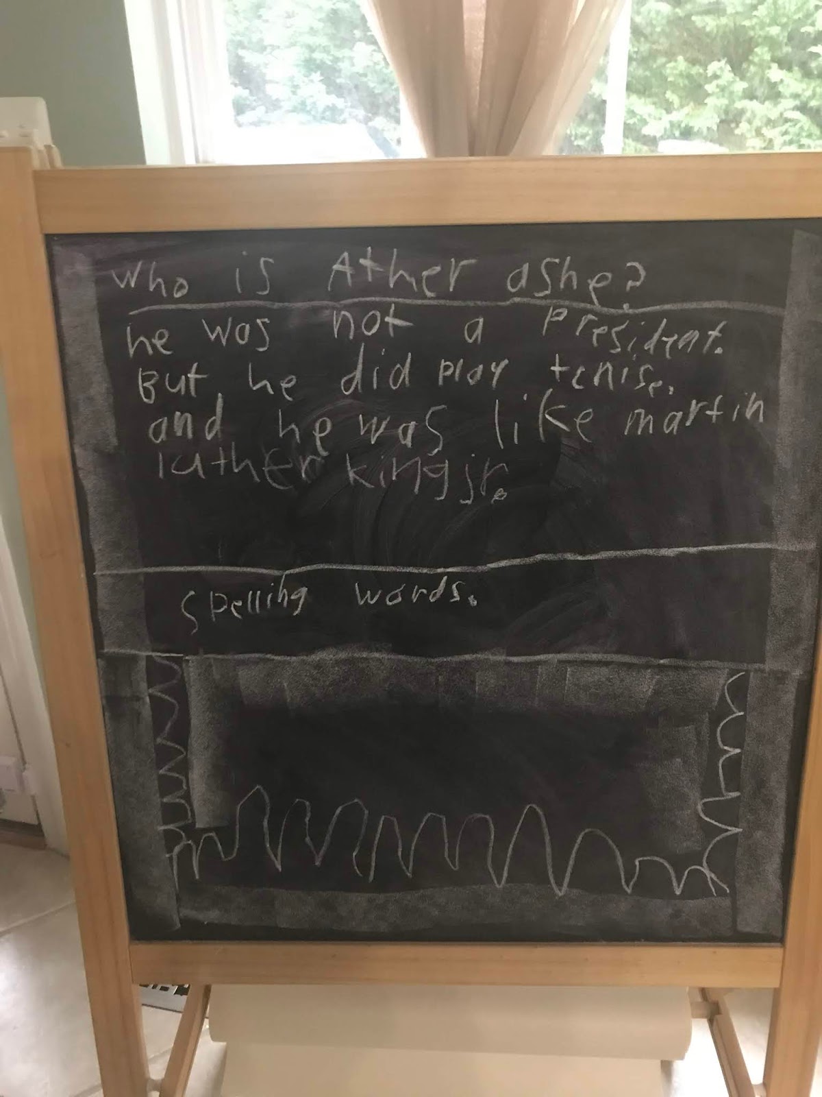 Xander made a quiz for Sterling. Who is Arthur Ashe? Then there were three true/false questions she had to answer. She got them all right (they're all true). Then he gave her a spelling test and she did great at that too!