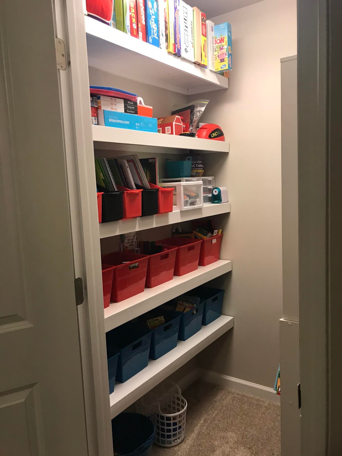 I completely emptied out the shelves. Laid out all of the baskets and organized the games up top. I still need to label the baskets so everything is easy to find.